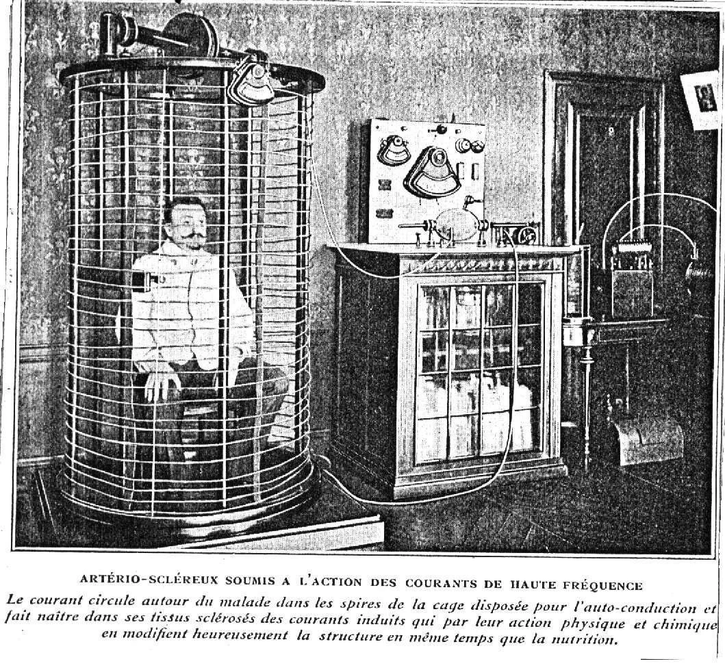 An image of an “auto-conduction cage” as used by D’Arsonval and his medical followers.