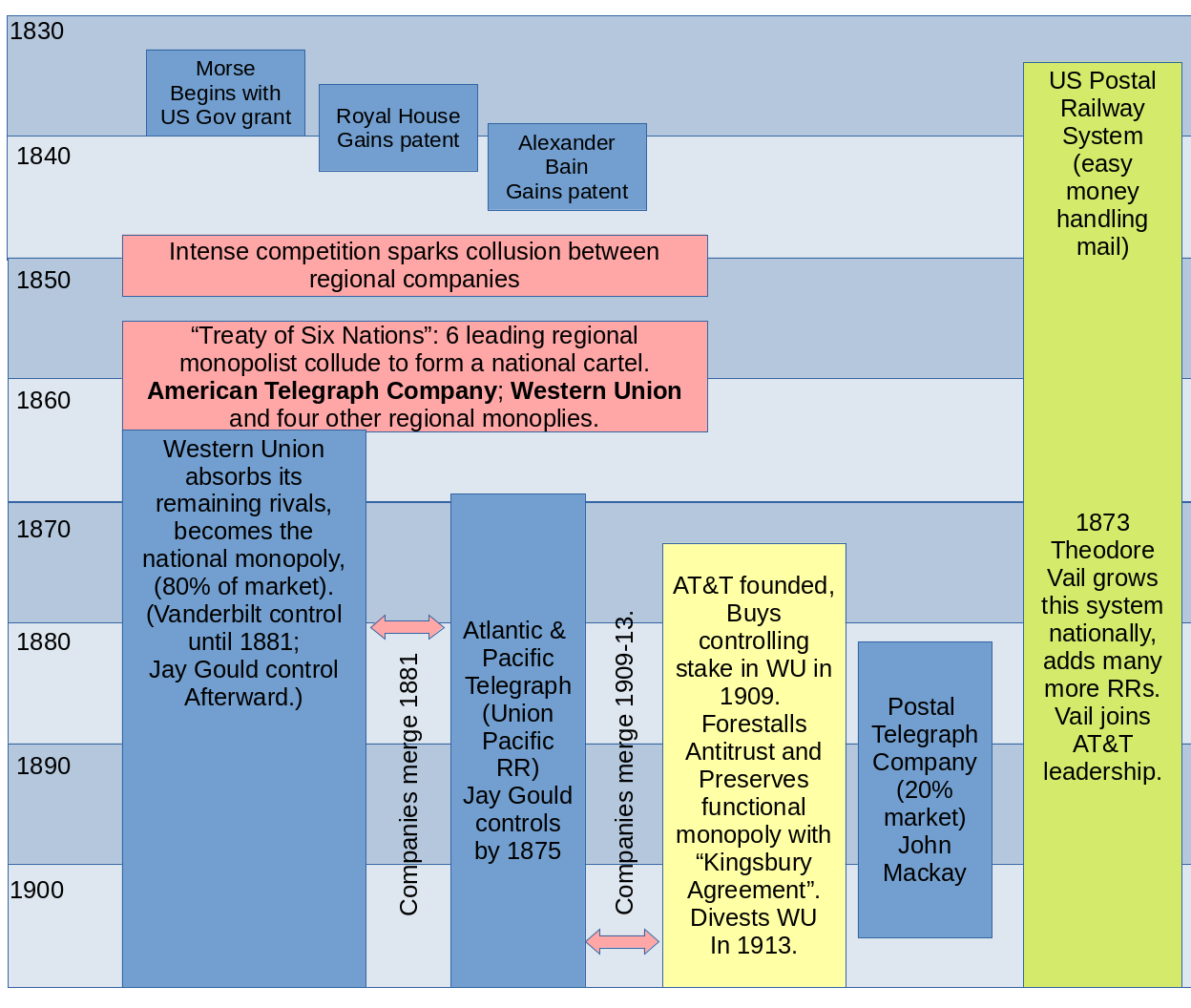 What does all that mean? Below is a time line showing how Morse’s telegraph company and its competitors became “Western Union” and how Western Union was absorbed into ‘Ma Bell’.