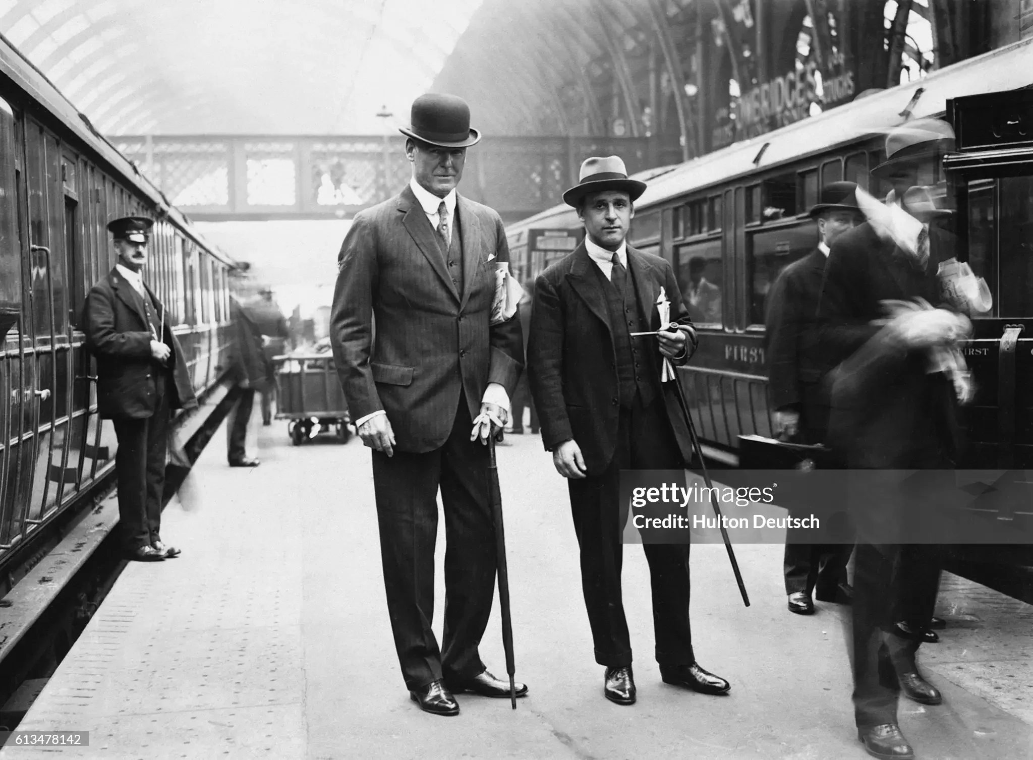 “Sir Trevor Dawson and Commander C.D. Burney the airship designer about to board a train at Kings Cross along with about 70 M.P.'s, bound for Yorkshire, where they will inspect Airship R100 at Howden. ca. 1925.” (Photo by © Hulton-Deutsch Collection/CORBIS/Corbis via Getty Images)