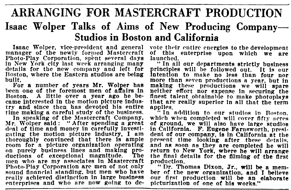 Farnsworth next appeared back in Boston in 1922, as head of a Nativist organization called the Loyal Coalition. From here, he became head of the regional Klan for about 18 months, moved into a mansion, and was then expelled over obscure money problems. (For commentary on this second incarnation of the Klan and the 1930s pornography business, see my post on Albert Dezel.) Farnsworth drops from the print record at this time, but he did last longer than Mastercraft Photo-Play Corp., which went away in 1917. Isaac Wolper, however, did not go away.