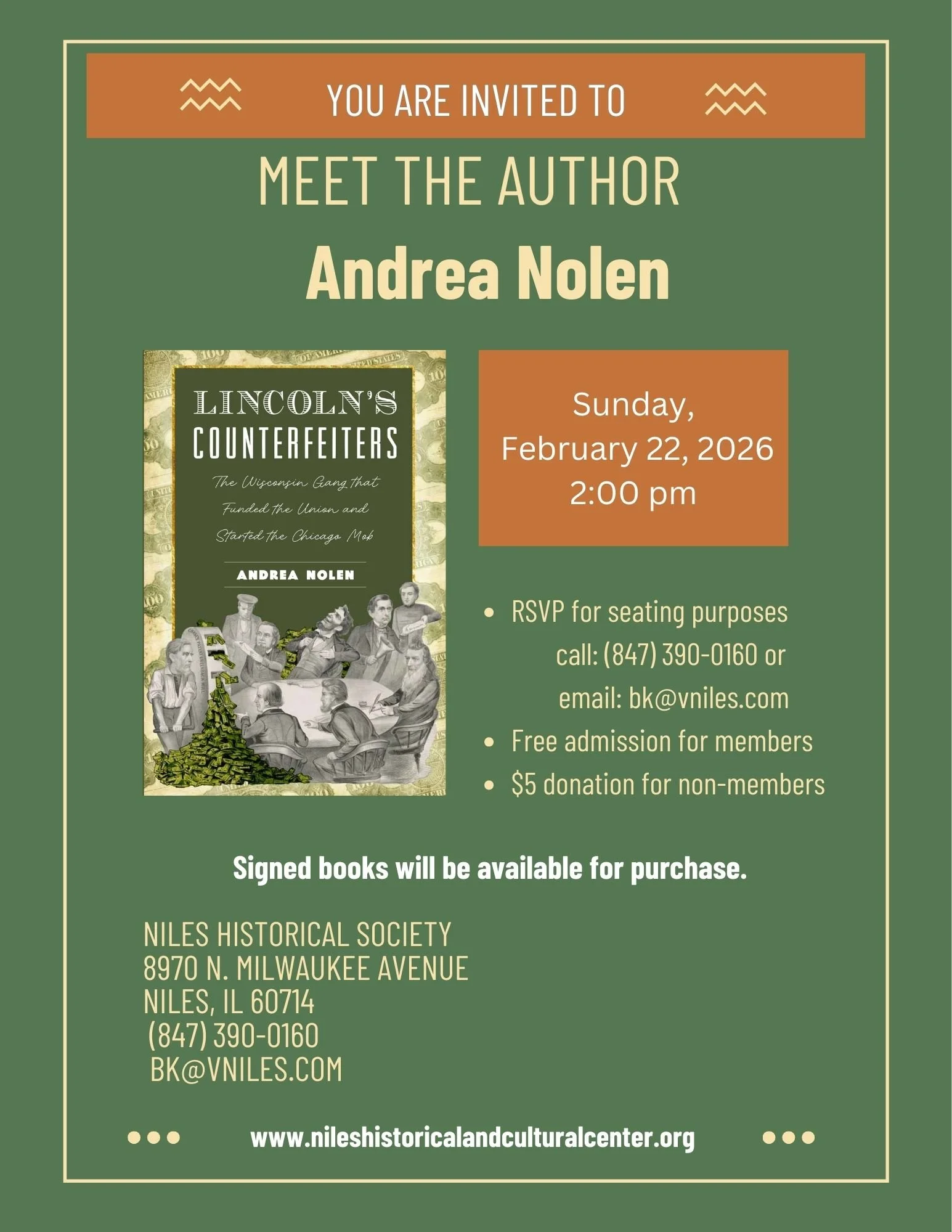 Hello Lincoln’s Counterfeiters fans! I’m honored to say that the Niles Historical Society will host me this Sunday, February 22nd at 2 PM.