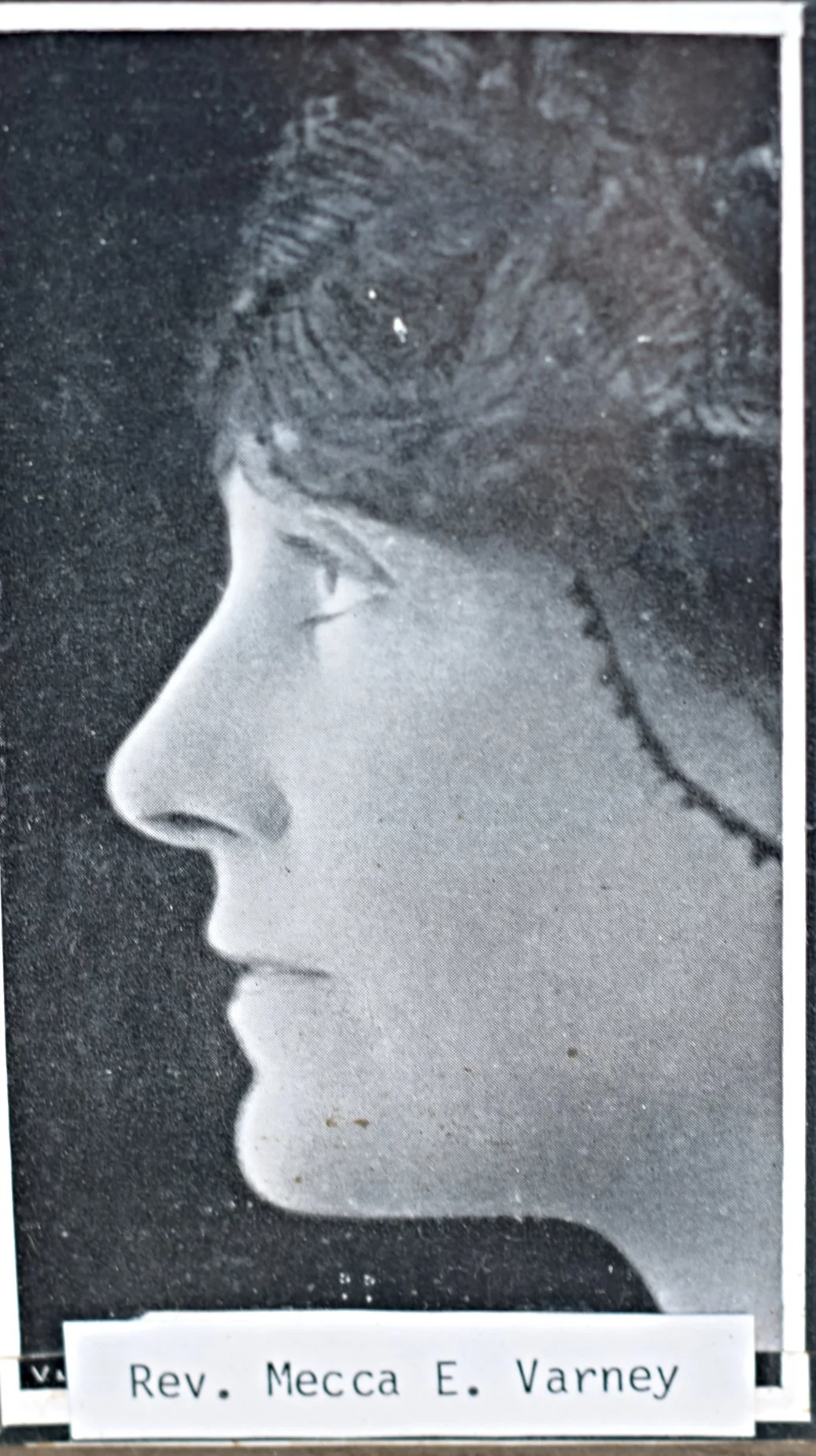 Rev. Mecca E. Varney, one of the early leaders of Monroe, WI’s Universalist Church. Mecca was probably born shortly after the US Civil War. At this time in the USA women “reverends” were exceedingly rare. Today, the Unitarian and Universalist denominations have merged and consider themselves Christian by historical coincidence only— you can be any faith and UU.