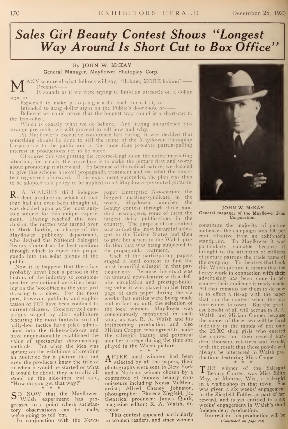 The National Salesgirls’ Beauty Contest was from the beginning an advertising exercise designed to promote the brand-new Mayflower Film concern (from the ashes of Mutual) and Ziegfeld’s girl-show-cum-movie-starlet-factory. Beyond this, however, it was an innovative experiment in marketing, as explained by Mayflower’s general manager John W. McKay on Christmas Day, 1920 (Exhibitors’ Herald):
